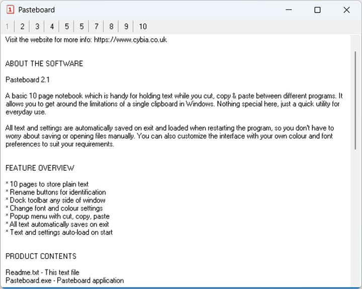 A basic 10 page notebook which is handy for holding text while you cut, copy and paste between different programs. It allows you to get around the limitations of a single clipboard in Windows. Nothing special here, just a quick utility for everyday use.