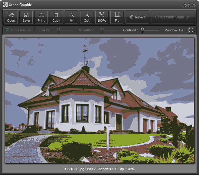 Urban Graphic is very fast and easy to use. Just click on the Open button and choose a suitable photograph or 3D rendered image, select the amount of colours and smoothing via the appropriate sliders, then click the Start Conversion button and watch the app automatically do the hard work for you!
